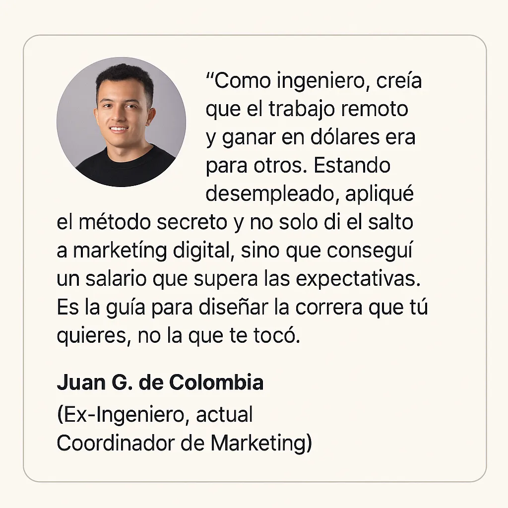 Como Ingeniero, creía que mi futuro profesional estaba definido, pero no era el camino que realmente me apasionaba. Así que descifré y apliqué un método para reinventar mi perfil por completo y dar el salto a un área totalmente nueva.